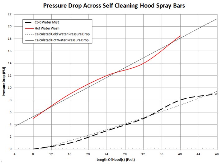 30 psi constant water pressure is required to guarantee proper operation of the Self Cleaning Hood. 50 psi is the maximum water pressure permitted on this system. Depending on the length of hood(s), the minimum allowable water pressure changes. The longer the hood(s), the higher the minimum water pressure. The graph below shows the pressure drop through self cleaning hood spray bars.
