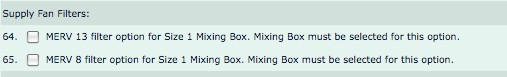 For applicable units, when a mixing box is chosen, the integral filters will be shown under the heading ‘Supply Fan Filters’. The associated static loss will be shown next to the selection. ![]()