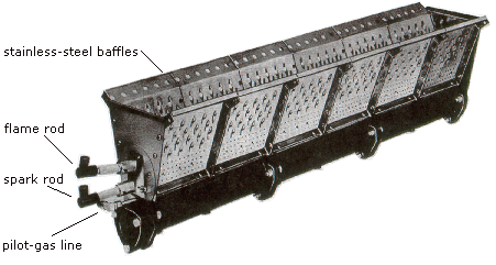 Fuel gas is fed directly into the make-up air burner. The air stream's kinetic energy furnishes combustion air. It functions properly at the velocity and pressures associated with usual ventilating systems. The burner operation: the combination of velocity impact and suction generated by the combustion-baffles shape induces air through the ports into the combustion zone. The air supply is constant, though only mixes with the gas flowing into the burner ports. When a very small quantity of gas is admitted to the burner, sufficient air to gas mixing takes place in the low-fire slot within the burner casting. Combustion takes place in this zone. Since the burner casting contains the low-fire zone, the casting shields the flame from uncontrolled air entry. Increasing gas supply moves the flame out to the intermediate fire zone for additional air. At full capacity, mixing occurs at the larger air ports of the high-fire zone, enhanced by air spilling over the end of the baffles. Reducing the gas supply reverses the sequence - flame recedes to the air-supply location until the low-fire zone is reached. |